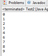 public class Test2 { /** * @param args */ public static void main(String[] args) { // TODO Auto-generated method stub int i; for(i=0;i<=9;i++){ if(i!=5) System.out.println(i); } } }