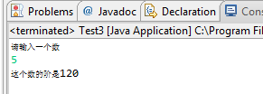 import java.util.Scanner; public class Test3 { /** * @param args */ public static void main(String[] args) { // TODO Auto-generated method stub Scanner input = new Scanner(System.in); System.out.println("请输入一个数"); int x = input.nextInt(); int sum = 1; int i; for(i = 1; i<=x; i++){ sum*=i; } System.out.println("这个数的阶是"+sum); } }
