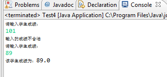 import java.util.Scanner; public class Test4 { /** * @param args */ public static void main(String[] args) { // TODO Auto-generated method stub Scanner input = new Scanner(System.in); int i; for(i=0;;i++){ System.out.println("请输入学生成绩:"); double x=input.nextDouble(); if(x<0||x>100){ System.out.println("输入的成绩不合法"); }else{ System.out.println("该学生成绩为:"+x); break; } } } }