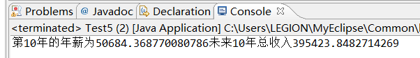 package exp5; public class Test5 { /** * @param args */ public static void main(String[] args) { // TODO Auto-generated method stub double x=30000; double sum=30000; for(int i=2;i<11;i++){ x=x*(1+0.06); sum=sum+x; } System.out.println("第10年的年薪为"+x+"未来10年总收入"+sum); } }