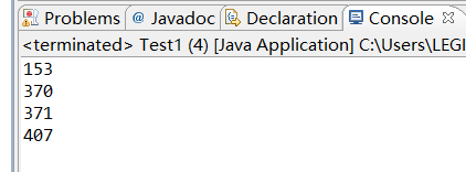 package homework5; public class Test1 { /** * @param args */ public static void main(String[] args) { // TODO Auto-generated method stub int a=100; while(a<1000){ int a1=a%10; int a2=a/10%10; int a3=a/100; if(a1*a1*a1+a2*a2*a2+a3*a3*a3==a){ System.out.println(a); } a++; } } }