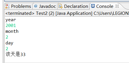 package homework5; import java.util.Scanner; public class Test2 { /** * @param args */ public static void main(String[] args) { // TODO Auto-generated method stub Scanner input=new Scanner(System.in); System.out.println("year"); int year=input.nextInt(); System.out.println("month"); int month=input.nextInt(); System.out.println("day"); int day=input.nextInt(); int mun=0; for(int i=1;i<month;i++){ switch (i){ case 4: case 6: case 9: case 11: mun=mun+30; break; case 1: case 3: case 5: case 7: case 8: case 10: case 12: mun=mun+31; break; case 2: if(year%4==0&year%100!=0|year%400==0) mun=mun+29; else mun=mun+28; break; } } mun=mun+day; System.out.println("该天是"+mun); } }