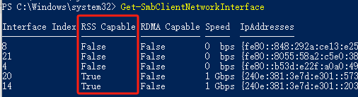 4、Get-SmbMultichannelConnection 中的Client RSS Capable 全部为true (都不支持的当然是false)