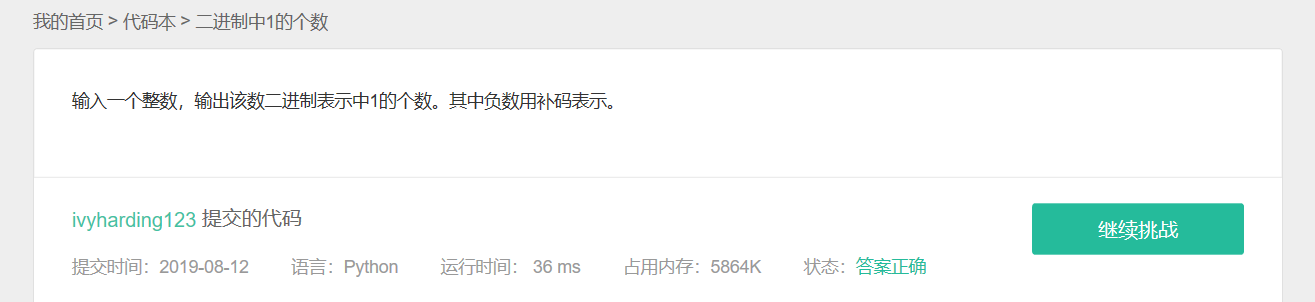 # -*- coding:utf-8 -*- class Solution: def NumberOf1(self, n): # write code here # 通过bin()可以直接将正数转为01二进制,而负数经过bin()转换得到的是带有“-”符号的字符串 # 针对负数,我们那他和32位1做与运算 if n < 0: n = n&0xFFFFFFFF count = 0 for i in str(bin(n)): if i == "1": count += 1 return count