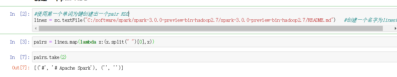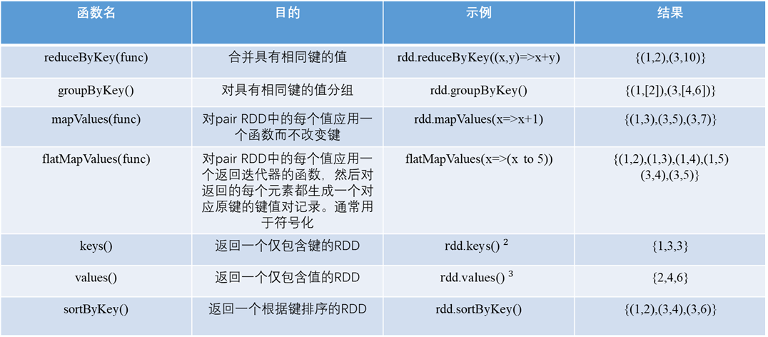 如果将一个普通的RDD转为pair RDD,可以调用map()实现,传递的函数需要返回键值对。