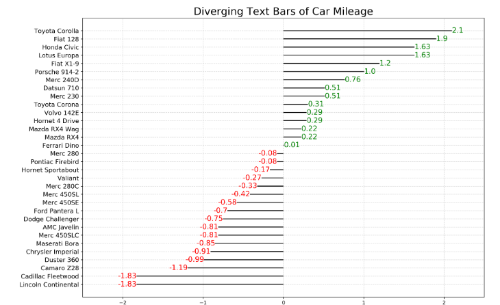 plt.title('Diverging Text Bars of Car Mileage', # 图像标题名称