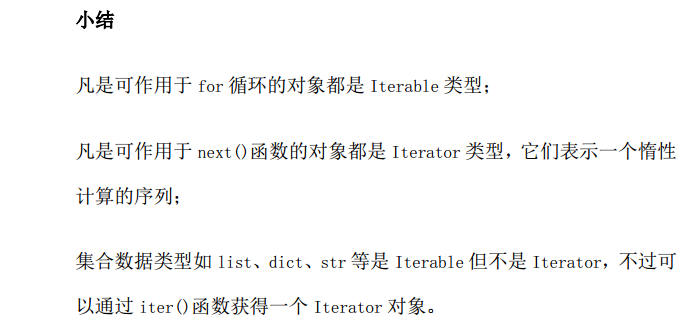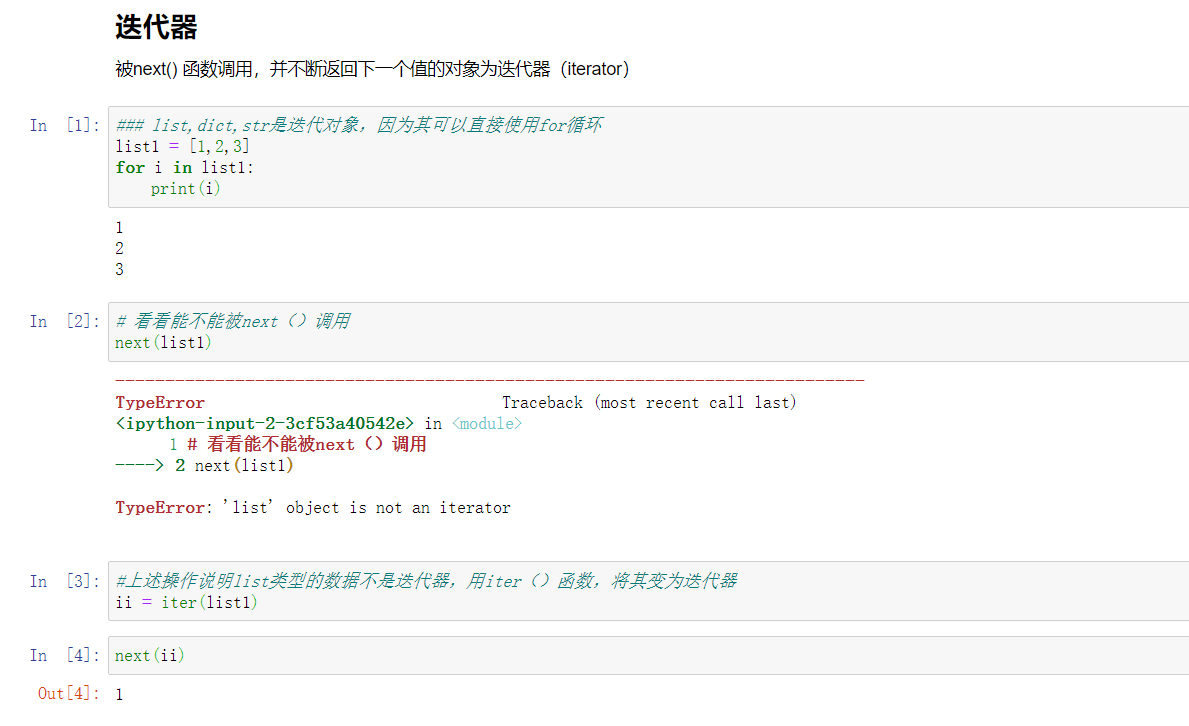 迭代器的概念: 可以被被next()函数调用,并不断返回下一个值的对象是迭代器