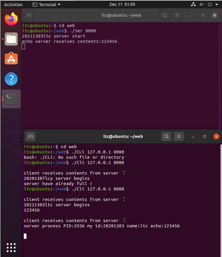 #include <stdio.h> #include <netinet/in.h> #include <arpa/inet.h> #include <netdb.h> #include <sys/types.h> #include <sys/socket.h> #include <stdlib.h> #include <string.h> #define RIO_BUFSIZE 8192 typedef struct { int rio_fd; int rio_cnt; char *rio_bufptr; char rio_buf[RIO_BUFSIZE]; } rio_t; #define MAXLINE 200 int main(int argc, char **argv) { int clientfd, port; char *host, buf[MAXLINE]; char sbuf[MAXLINE]; char rbuf[MAXLINE]; rio_t rio; char str1[MAXLINE] = "服务器进程pid:"; char str2[MAXLINE] = "服务器实现者学号姓名:20201329 魏赫"; char str3[MAXLINE] = "echo:"; if (argc != 3) { fprintf(stderr, "usage:%s <host> <port>\n", argv[0]); exit(0); } host = argv[1]; port = atoi(argv[2]); clientfd = open_clientfd(host, port); while (1) { scanf("%[^\n]", sbuf); send(clientfd, sbuf, MAXLINE, 0); recv(clientfd, rbuf, MAXLINE, 0); printf("%s", str1); printf("%d\n", getpid()); printf("%s", str2); putchar('\n'); printf("%s", str3); puts(rbuf); close(clientfd); exit(0);