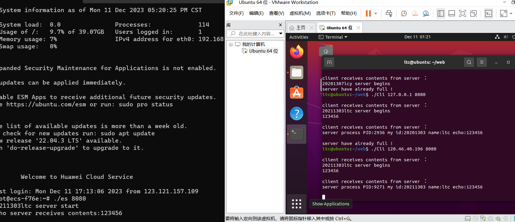#include <stdio.h> #include <netinet/in.h> #include <arpa/inet.h> #include <netdb.h> #include <sys/types.h> #include <sys/socket.h> #include <stdlib.h> #include <string.h> #define RIO_BUFSIZE 8192 typedef struct { int rio_fd; int rio_cnt; char *rio_bufptr; char rio_buf[RIO_BUFSIZE]; } rio_t; #define MAXLINE 200 int main(int argc, char **argv) { int clientfd, port; char *host, buf[MAXLINE]; char sbuf[MAXLINE]; char rbuf[MAXLINE]; rio_t rio; char str1[MAXLINE] = "客户端IP:"; char str2[MAXLINE] = "服务器实现者学号:20211303ltc"; char str3[MAXLINE] = "当地时间:"; if (argc != 3) { fprintf(stderr, "usage:%s <host> <port>\n", argv[0]); exit(0); } host = argv[1]; port = atoi(argv[2]); clientfd = open_clientfd(host, port); while (1) { recv(clientfd, rbuf, MAXLINE, 0); printf("%s", str1); puts(host); printf("%s", str2); putchar('\n'); printf("%s", str3); puts(rbuf); close(clientfd); exit(0); } }