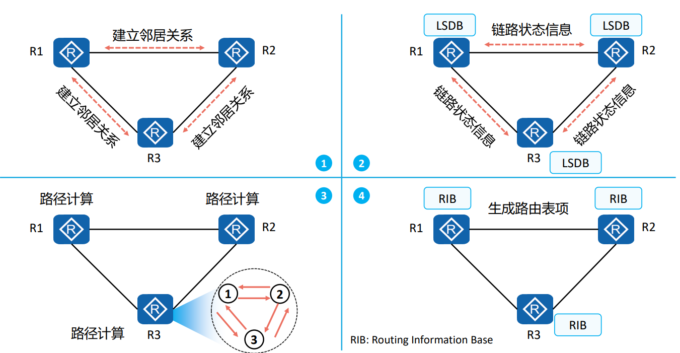 OSPF完成邻接关系的建立有四个步骤,建立邻居关系、协商主/从、交互LSDB信息,同步LSDB