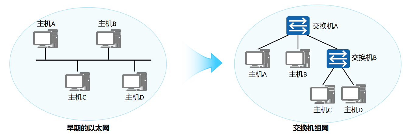 在传统的以太网中,同一介质上的多个节点共享链路,一台设备发出的广播报文,所有设备均会收到。