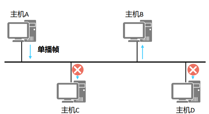 如果接收的是单播帧:交换机在MAC地址表中查到了这个帧的目的MAC地址,但是表中对应的端口编号是该帧从传输介质进入交换机的那个端口编号,则交换机对该单播帧执行丢弃操作。