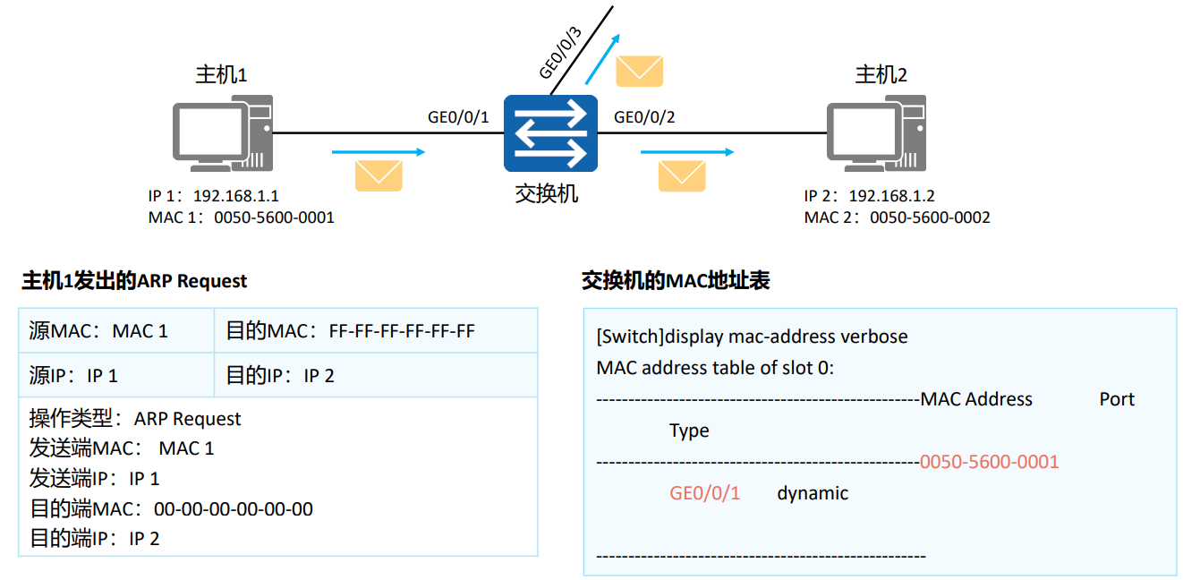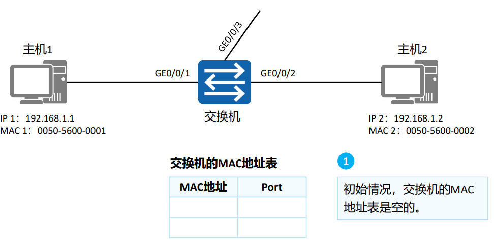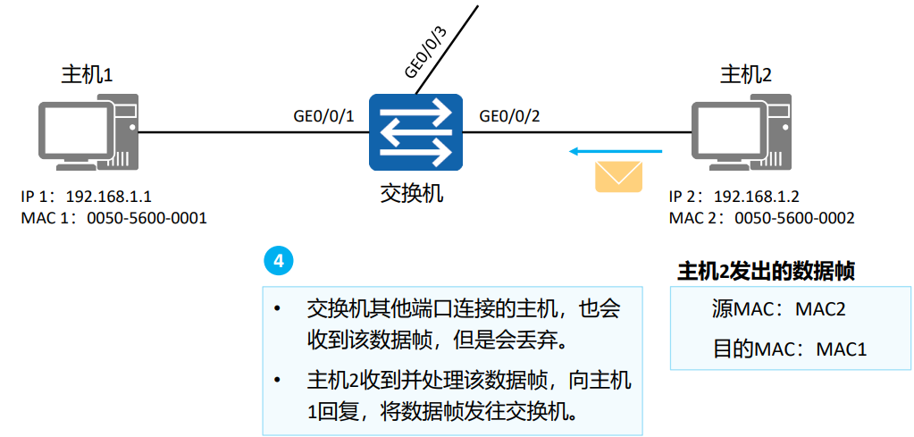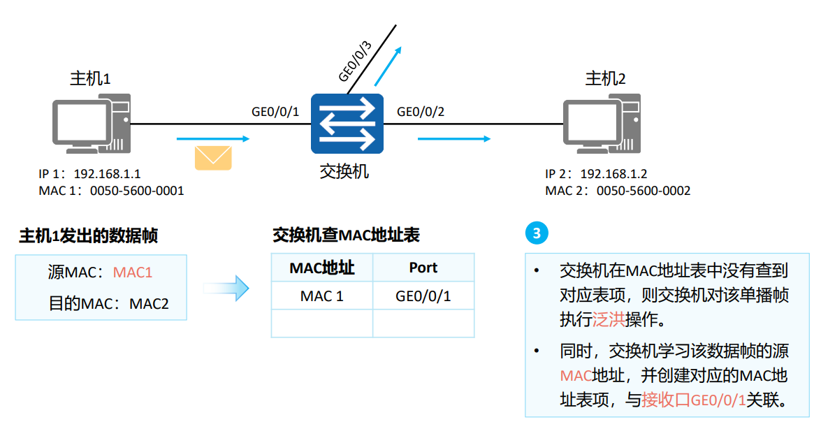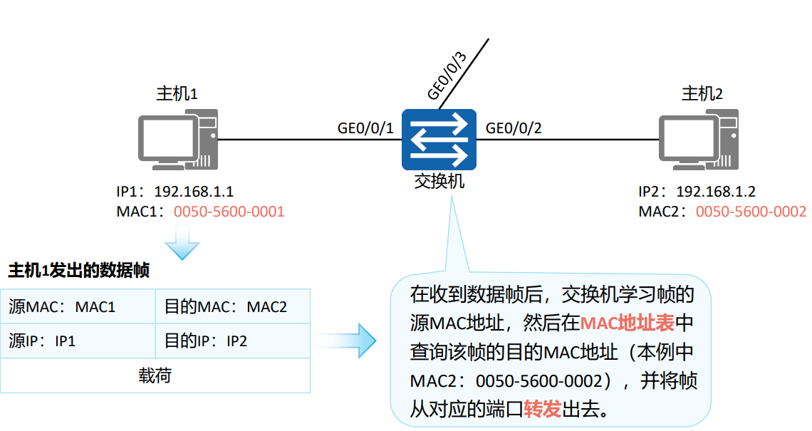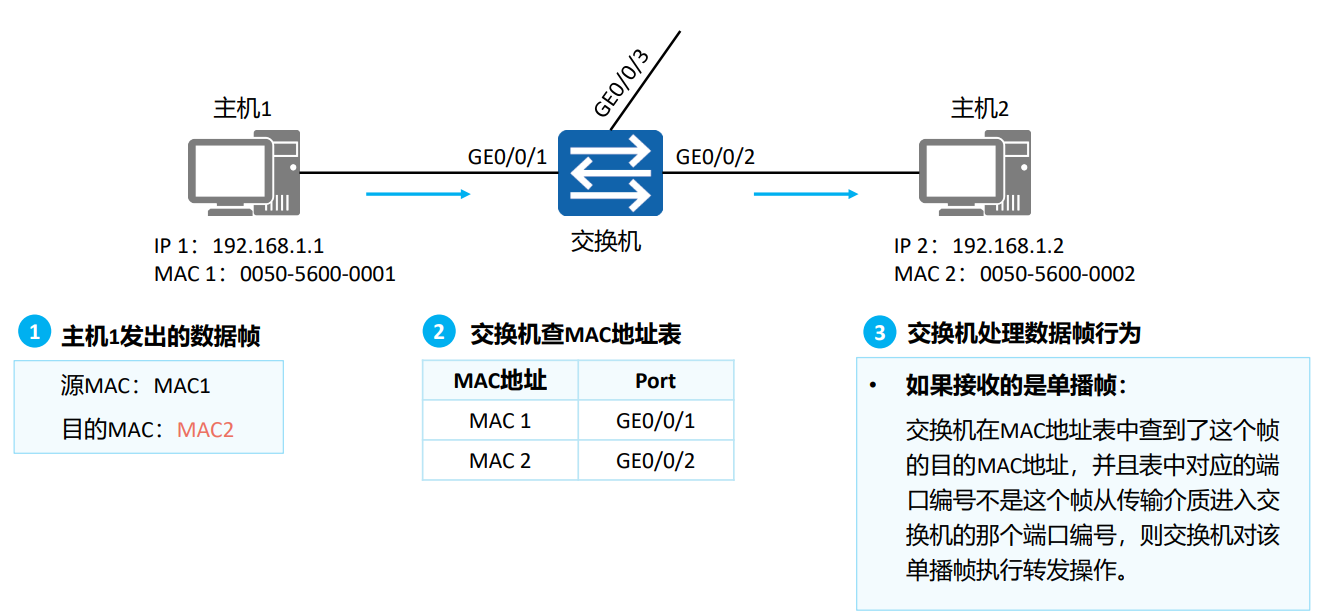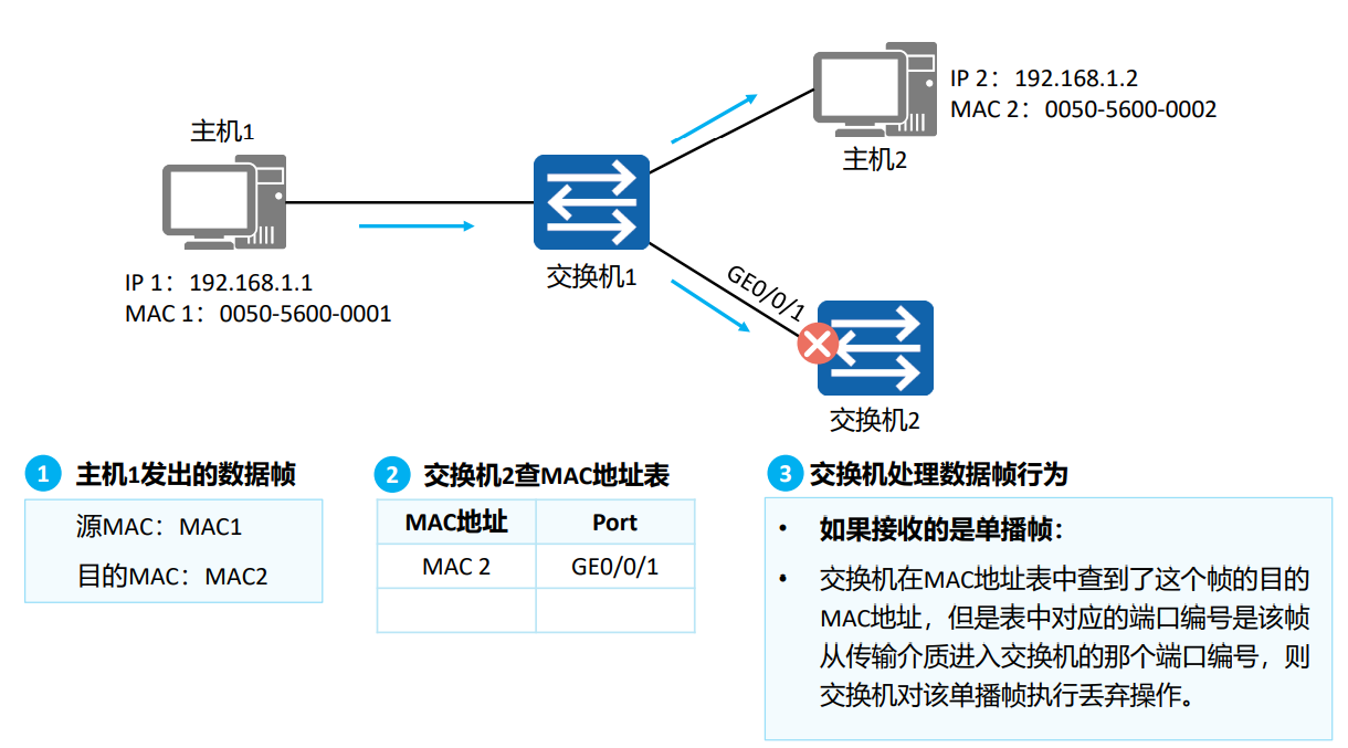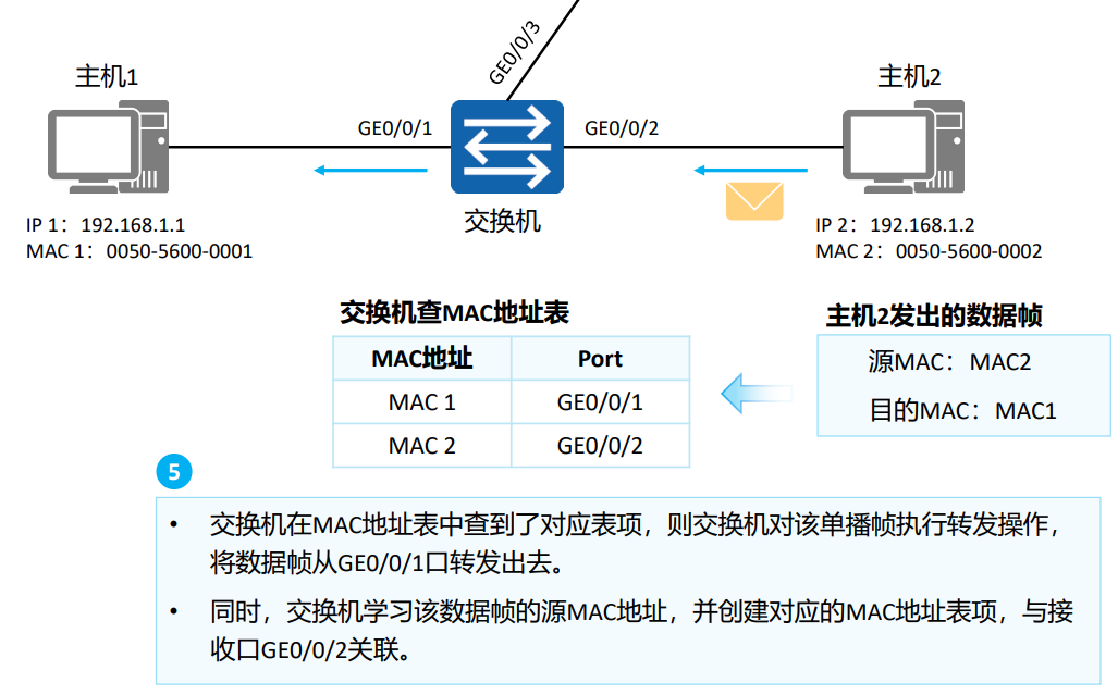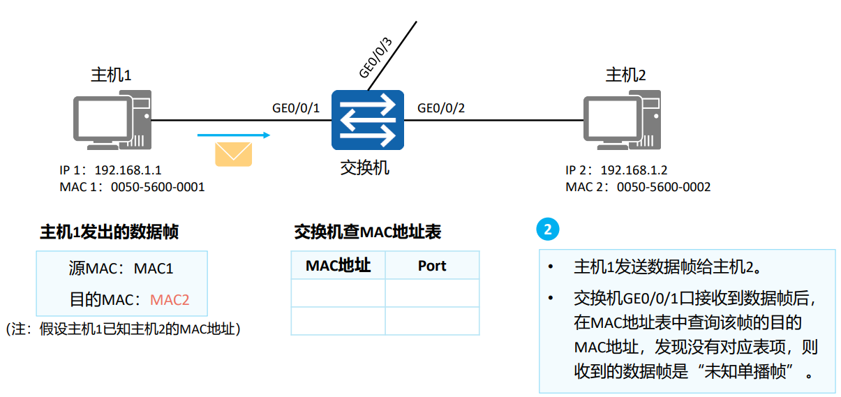 在收到数据帧后,交换机学习帧的源MAC地址,然后在MAC地址表中查询该帧的目的MAC地址(本例中MAC2:0050-5600-0002),并将帧从对应的端口转发出去。