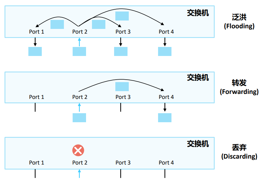 交换机对于从传输介质进入某一端口的帧的处理行为一共有3种: