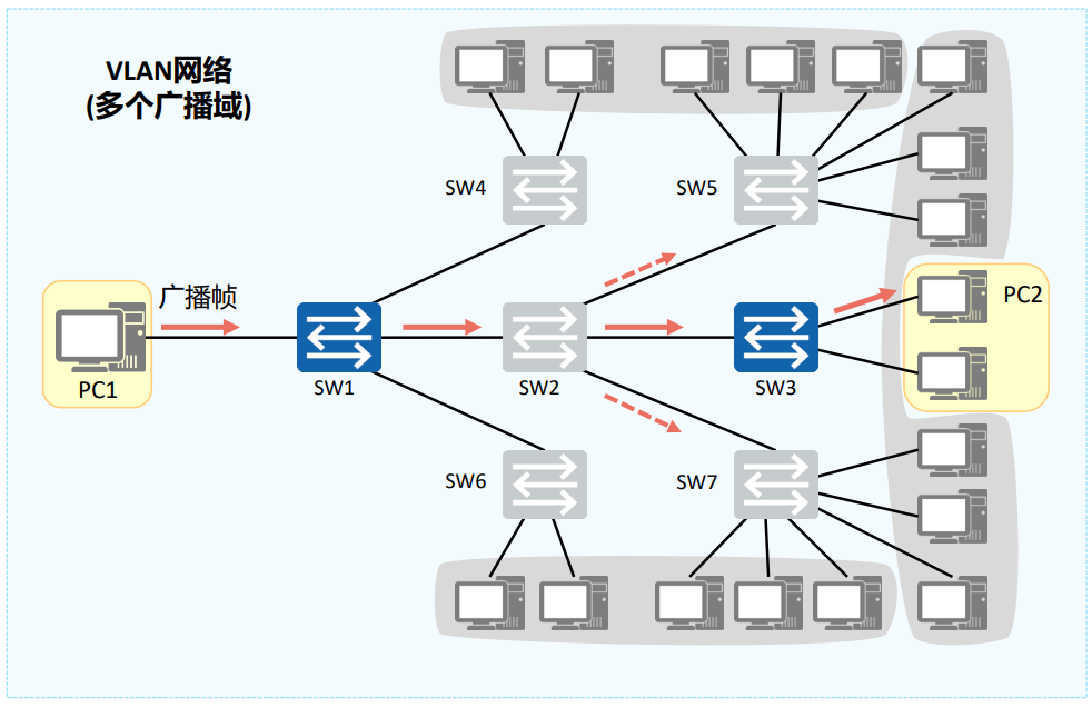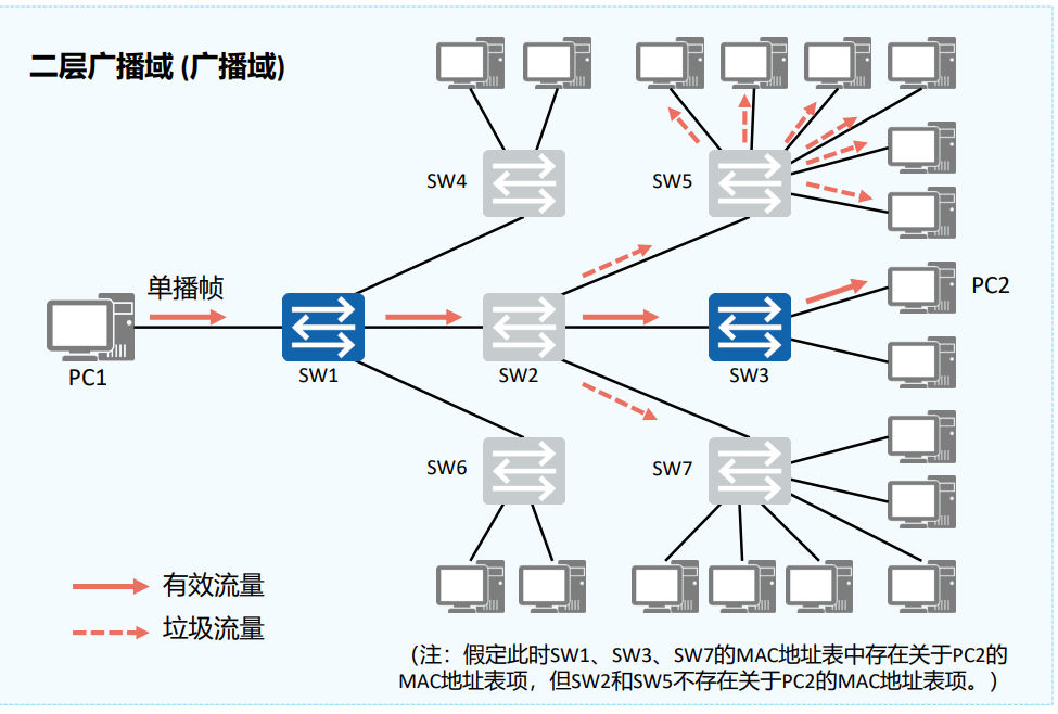在典型交换网络中,当某台主机发送一个广播帧或未知单播帧时,该数据帧会被泛洪,甚至传递到整个广播域。
