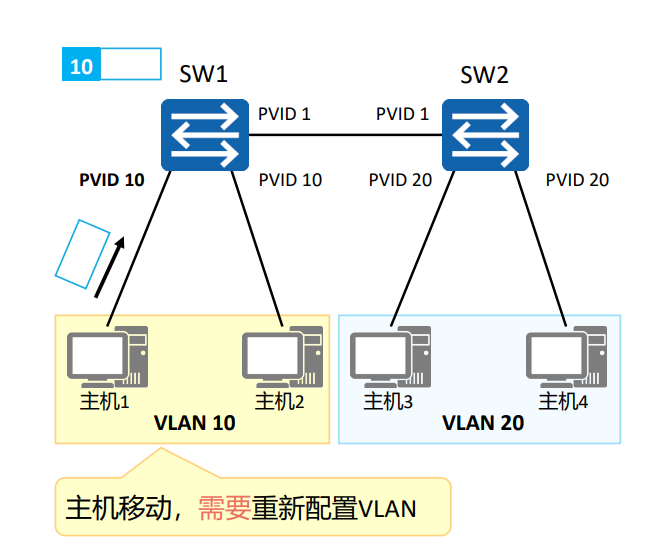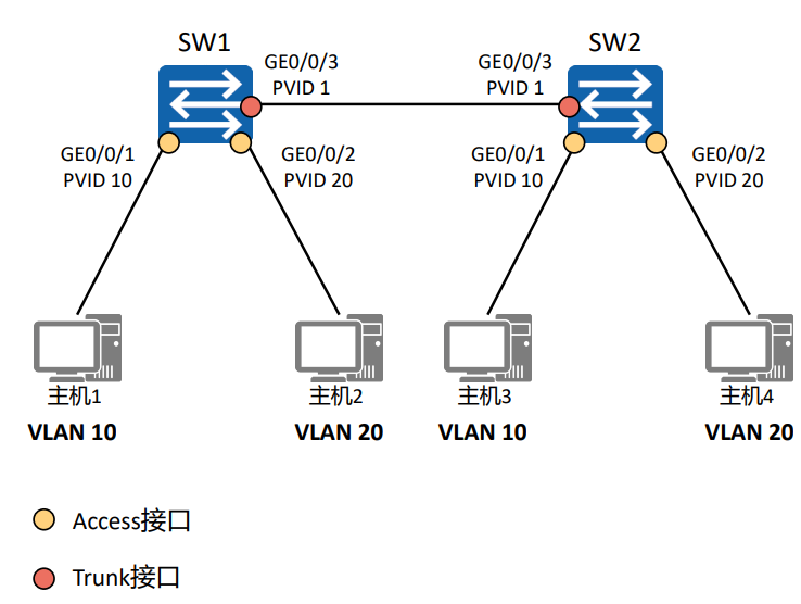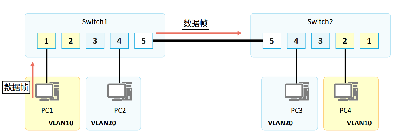 PC1发出的数据经过Switch1和Switch2之间的链路到达了Switch2。如果不加处理,后者无法判断该数据所属的VLAN,也不知道应该将这个数据输出到本地哪个VLAN中。