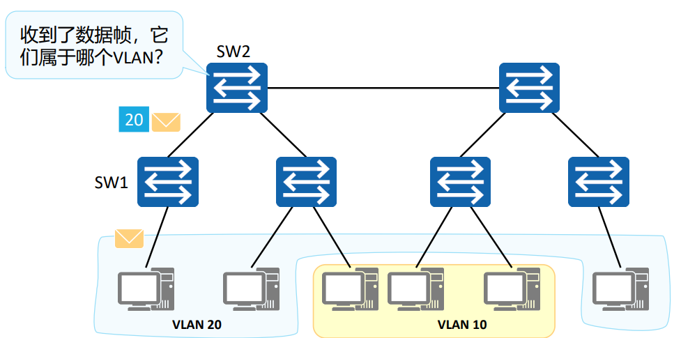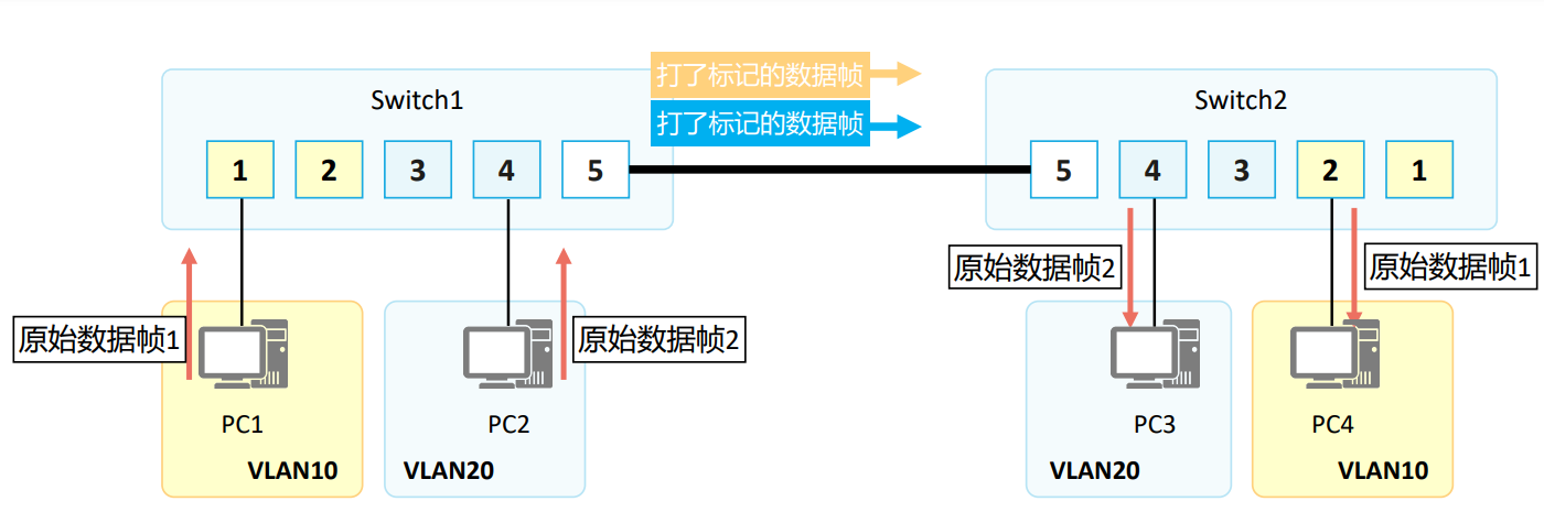 Switch1和Switch2之间的链路要承载多个VLAN的数据,需要一种基于VLAN的数据“标记”手段,以便对不同VLAN的数据帧进行区分。