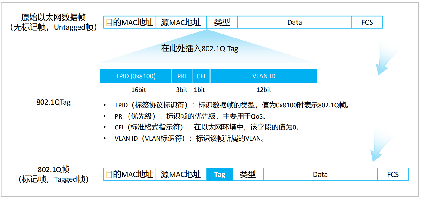 IEEE 802.1Q协议规定,在以太网数据帧中加入 4 个字节的VLAN标签,又称VLAN Tag,简称Tag。