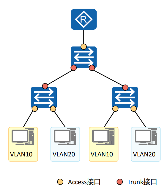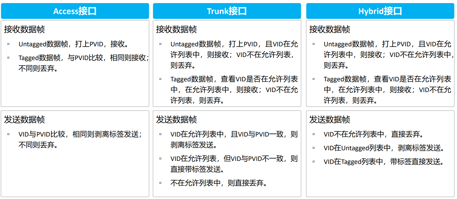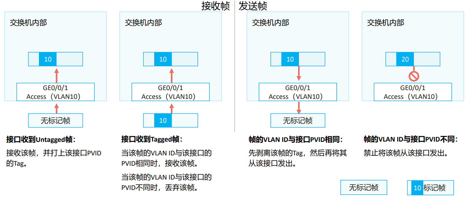 交换机上常用来连接用户PC、服务器等终端设备的接口。Access接口所连接的这些设备的网卡往往只收发无标记帧。Access接口只能加入一个VLAN。