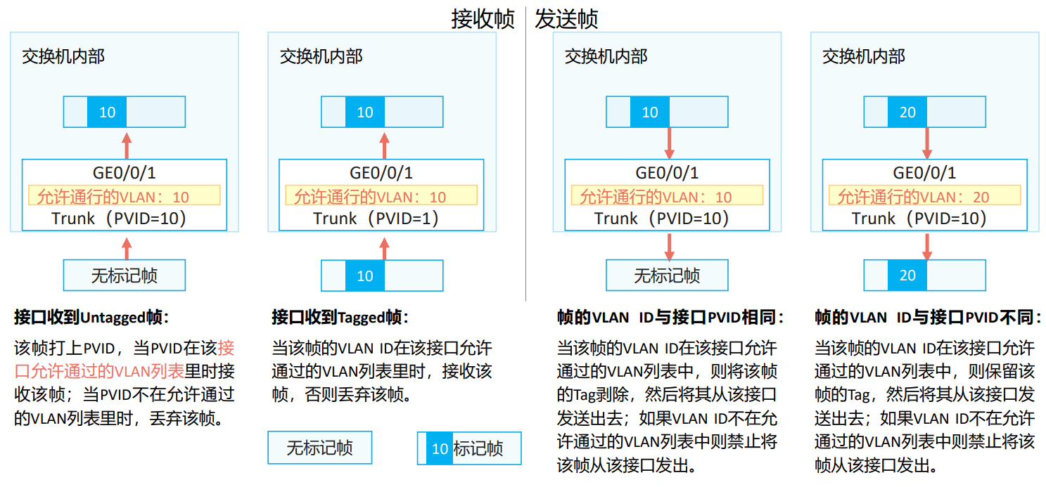 Trunk接口允许多个VLAN的数据帧通过,这些数据帧通过802.1Q Tag实现区分。Trunk接口常用于交换机之间的互联,也用于连接路由器、防火墙等设备的子接口