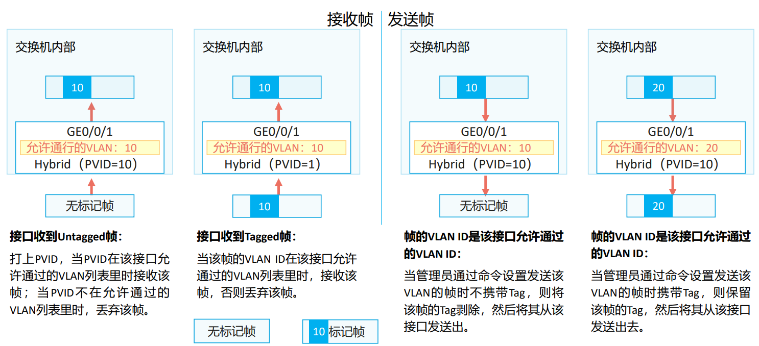 Hybrid接口与Trunk接口类似,也允许多个VLAN的数据帧通过,这些数据帧通过802.1Q Tag实现区分。用户可以灵活指定Hybrid接口在发送某个(或某些)VLAN的数据帧时是否携带Tag。