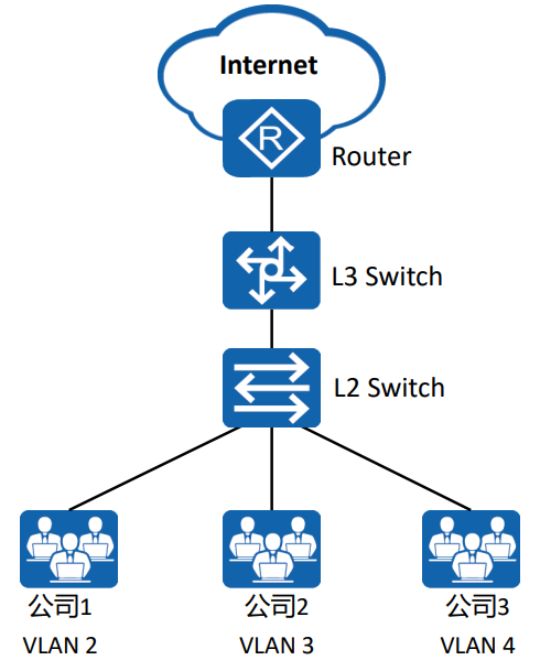 为了保证各公司业务的独立和安全,可将每个公司所连接的接口划分到不同的VLAN,实现公司间业务数据的完全隔离。可以认为每个公司拥有独立的“虚拟路由器”,每个VLAN就是一个“虚拟工作组”。