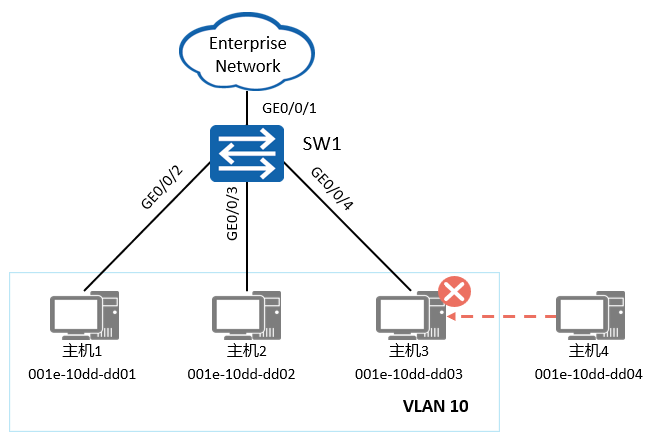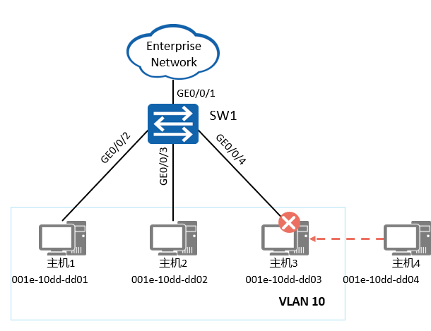 主机1、主机2、主机3为本部门员工的主机,要求这几台主机可以通过SW1访问公司网络,如换成其他主机则不能访问。