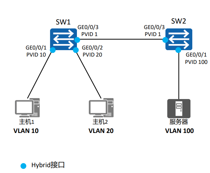 [SW1-GigabitEthernet0/0/2] port link-type hybrid
