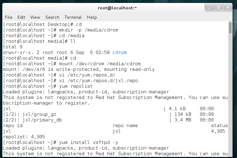 检查安装vsftp服务器,挂载系统光盘到/media/cdrom下以便调取