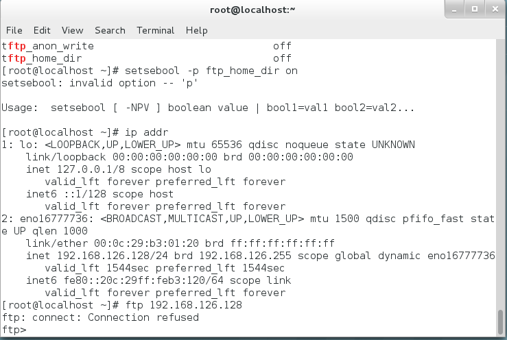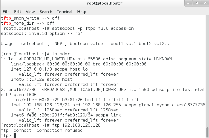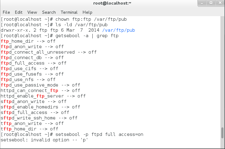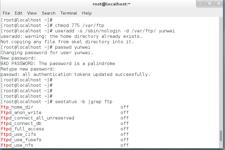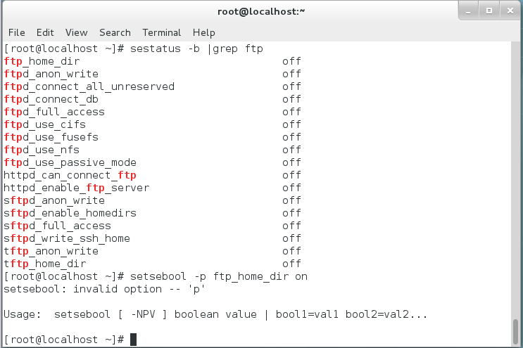 使用getsebool -a | grep ftp查看ftp相关状态。