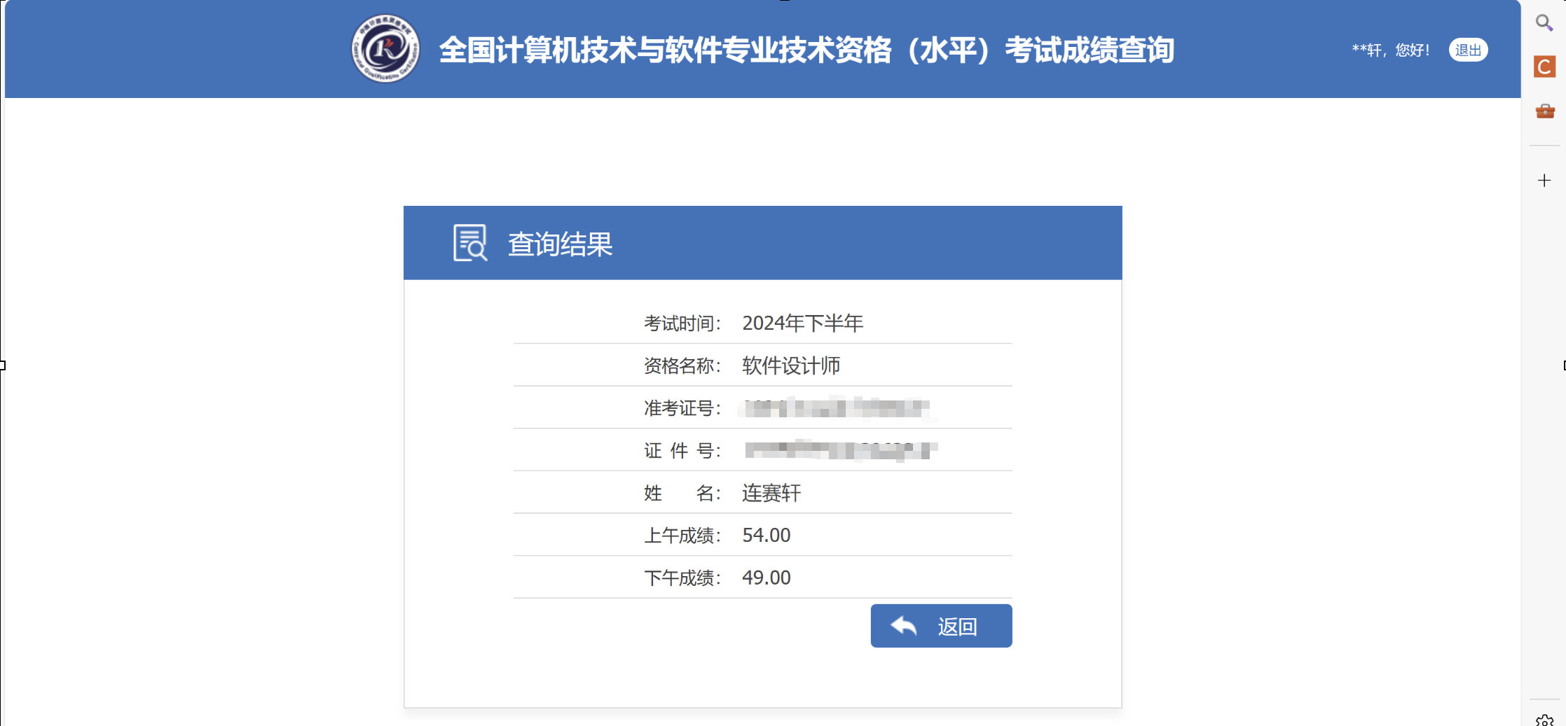 2024下半年中级软件设计师考试通过,20224089连赛轩申请加分10分