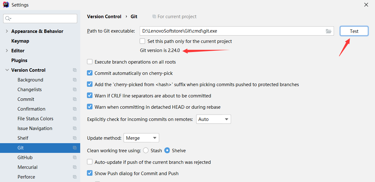 在setting中获取git路径 进行test 会出现git版本号