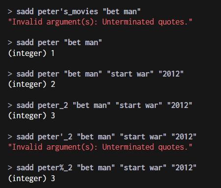 左图是官网上的集合实例,自己敲敲报错。"Invalid argument(s): Unterminated quotes."