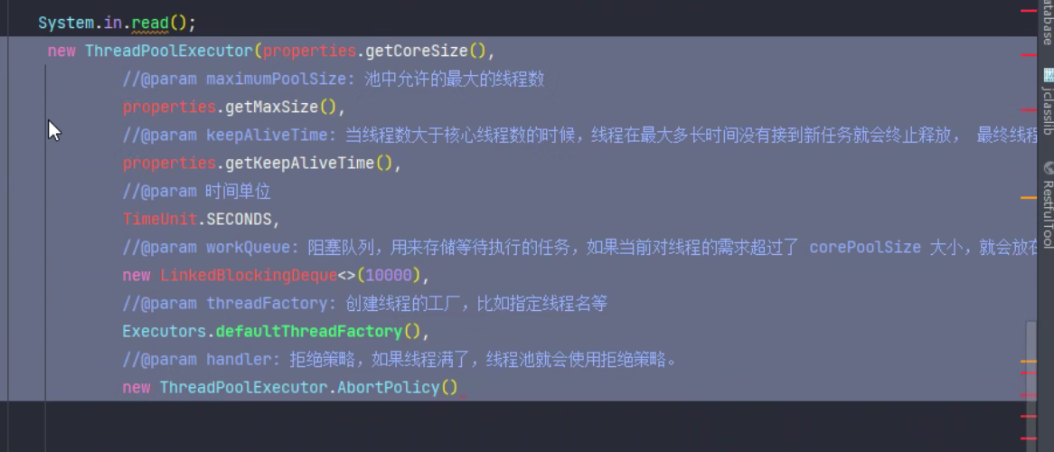 1 @SpringBootTest 2 public class DockerTest { 3 @Resource(name="redisTemplate") 4 private ValueOperations<String,Integer> valueOperations; 5 @Autowired 6 private StringRedisTemplate stringRedisTemplate; 7 @Test //初始化 Redis库存量 8 void test() throws IOException { 9 valueOperations.set("producthh",20); 10 } 11 12 @Test 13 void Test111() throws IOException { 14 ExecutorService executorService = Executors.newCachedThreadPool(); 15 StringBuilder letter = new StringBuilder(); 16 letter.append(" local qty1 = redis.call('get',KEYS[1]) "); 17 letter.append(" local qty2 = ARGV[1] "); 18 letter.append(" if (tonumber(qty1) >= tonumber(qty2)) "); 19 letter.append(" then "); 20 letter.append(" redis.call('decrby',KEYS[1],qty2) "); 21 letter.append(" return -1 "); 22 letter.append(" else "); 23 letter.append(" return tonumber(qty1) "); 24 letter.append(" end "); 25 RedisScript<Long> script = RedisScript.of(letter.toString(), Long.class); 26 for (int i = 1; i < 10; i++) { 27 int finalI = i; 28 executorService.execute(() -> { 29 int qty = RandomUtil.randomInt(1, 20); 30 Long ret = stringRedisTemplate.execute(script, CollUtil.newArrayList(key), String.valueOf(qty)); 31 if (ret == -1) { 32 System.out.println(finalI + "扣减成功->" + qty); 33 } else { 34 System.out.println("失败,需要:" + qty + " 剩余库存:" + ret); 35 } 36 }); 37 38 39 } 40 41 ThreadUtil.safeSleep(10000); 42 43 44 } 45 46 }