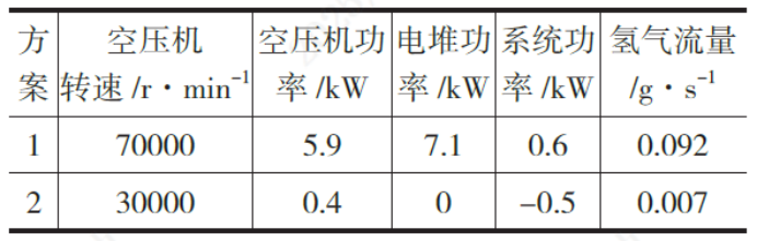 应用AMESim软件对实现怠速零功率的两种技术路线方案进行仿真,仿真结果见上表,由上表可知,方案1通过增加空压机转速将空压机功耗增加至5.9kW,系统输出功率降低至0.6kW,但氢气消耗量为0.092g/s。方案2通过电堆开路运行实现电堆零功率,系统输出功率-0.5kW(主要是空压机和水泵及回氢泵的功率消耗),氢气平均消耗量为0.007g/s,远低于方案1,主要为排氢阀开启期间损失的氢气量。2种方案的燃料电池系统怠速零功率输出,但方案2的氢气消耗量比方案1低92.4%,从系统能耗的角度来看,方案2更优。AMESim软件对阴极氧气饥饿状态的电堆内部化学反应无法准确模拟,但从功率平衡的角度来对分析仿真结果,还是有较大的参考意义。