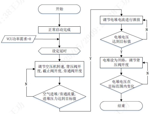 根据方案2设计了怠速零功率控制流程图,如下所示,燃料电池系统启动完成后,当整车控制器VCU发生需求功率为0时,燃料电池系统控制器关闭空气背压阀,并调节空压机转速,截止阀开度,旁通阀开度使空气旁通流量达到设定值。同时调节电堆电流对电堆进行泄放,当电堆总电压下降至目标值,电堆电流设为0A,电堆工作在开路状态,此时调节空气背压阀对电堆内部进行间歇供气,以实现阴极氧气饥饿,同时维持电堆电压在设定范围内变化。整个过程氢气系统正常工作并保证足够的氢气压力和排氢阀的周期性开闭。