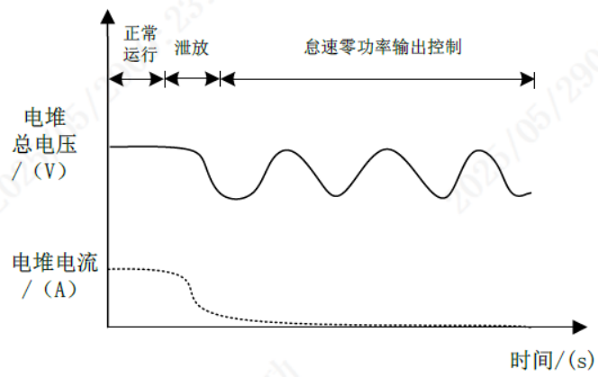 燃料电池系统从正常运行状态切换怠速零功率输出状态需要经过3个阶段,如下图所示,第一阶段是收到整车零功率请求后进行一定延时,第二阶段是通过泄放控制将电堆总电压调节到目标值以下。第三阶段是电堆电流为0A,阴极间歇供气将电堆总电压维持在一定范围内,电堆输出功率为0,燃料电池系统净输出功率为负,需要外部供电以维持空压机等附件功率消耗。