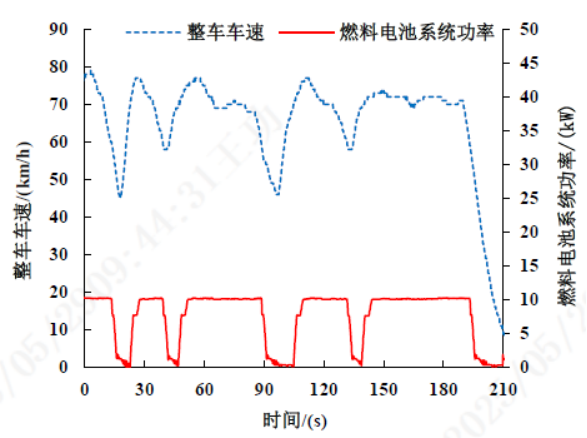 燃料电池系统搭载整车进行了怠速零功率工况验证,如下图所示,在18s、40s、96s、133、204s时整车处于减速工况并请求了5次怠速零功率(系统功率低于0时,仅显示为0),燃料电池系统可实时响应整车功率需求。