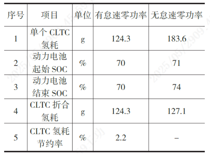 燃料电池系统搭载整车进行了CLTC循环工况对比试验,第1次试验时系统有怠速零功率功能,第2次试验时系统无怠速零功率功能,具体试验结果见下表。由表可知,具备怠速零功率功能燃料电池系统氢气消耗量降低2.2%,原因是怠速零功率可以维持动力电池SOC平衡,减少频繁开关机和充放电效率损失。