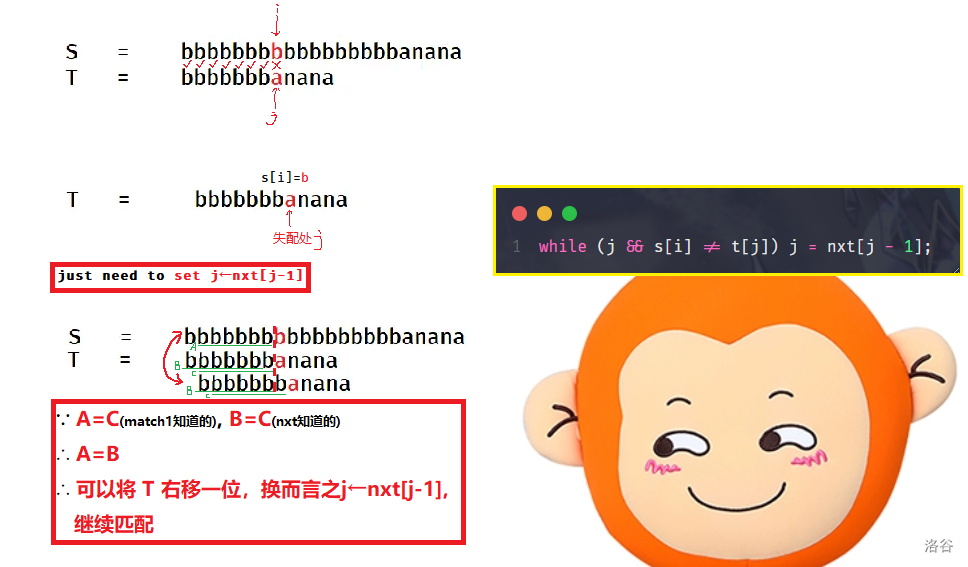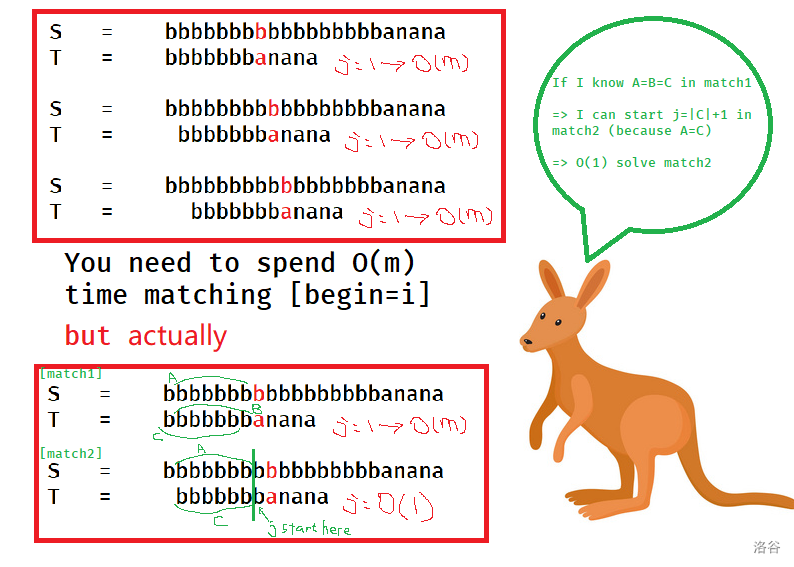 她的意思是,在 match1 时,我们知道了 \(A=B\)。假如我们用某种方法提前知道了 \(B=C\),那么在 match2 时,\(j\) 就不用回退那么多,从而加快计算。