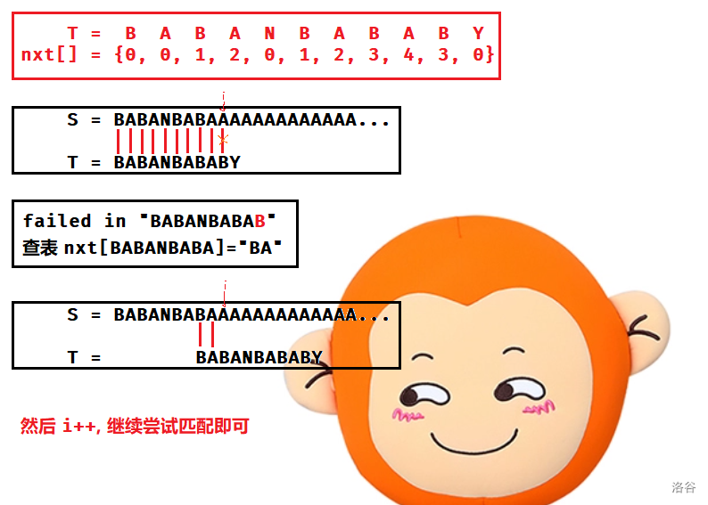 注意到小猴精妙地用 \(j\) 变化表示了 \(T\) 的匹配位置的变化。