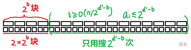 我们考察第 \(d\) 层,记其上一层 \(d^{\prime}=d-1\)。直接放缩复杂度,我们认为第 \(d^{\prime}\) 层全部块都被递归到了:那么显然块是均匀分布的,第 \(d^{\prime}\) 层的每一块长度都是 \(O(n/2^{d^{\prime}})\)。类似其他题解,假设第 \(d^{\prime}\) 层前 \(2^b\) 块全部都往下递归了;那么后面一段应当有 \(i\ge O(2^b\times n/2^{d^{\prime}})=O(n/2^{d^{\prime}-b})\),故后面一段 \(a_i\le O(2^{d^{\prime}-b})\)。此时看递归到第 \(d\) 层的情况,前面 \(2\times2^b\) 块,后面本质不同块只有 \(O(2^{d^{\prime}-b})\) 个,于是复杂度为