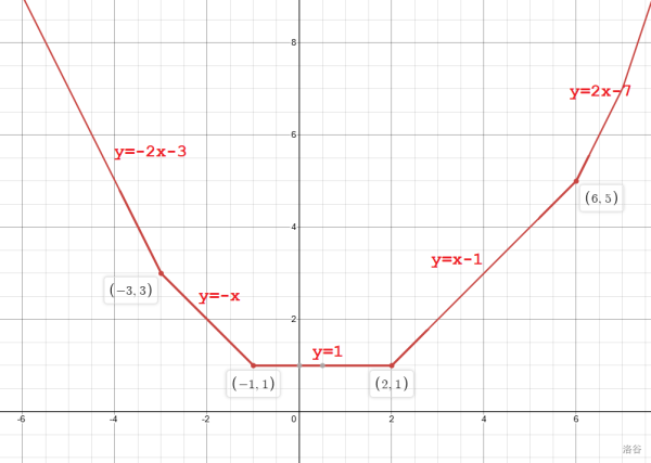 对于上图这个可怕的下凸函数,我们只需要记录初始一次函数 \(y=-2x-3\),转折点 \(S=\{-3,-1,2,6\}\)。
