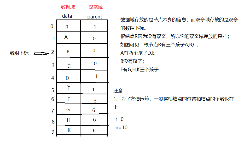 - 双亲域:指示本结点的双亲结点在数组中的位置。
