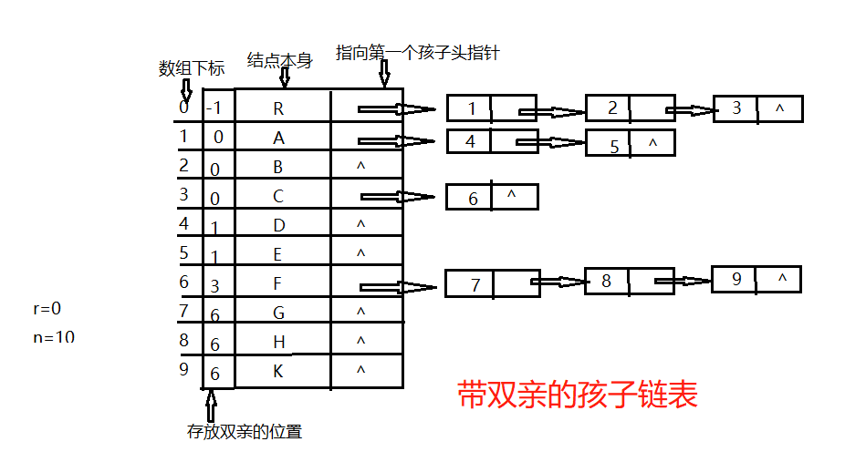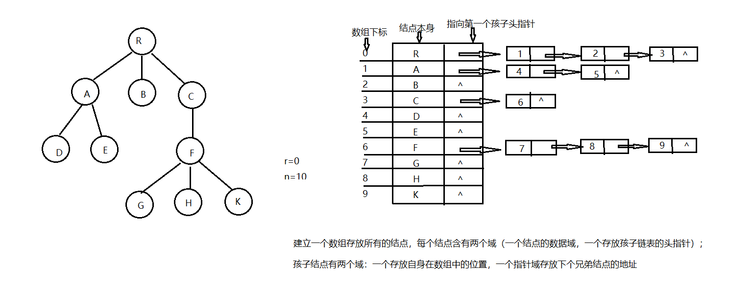 - 定义:把每个结点的孩子结点排列起来,看成是一个线性表,用单链表存储,则n个结点有n个孩子链表(叶子结点的孩子链表为空表)。而n个头指针又组成一个线性表,用顺序表(含有n个元素的结构数组)存储。