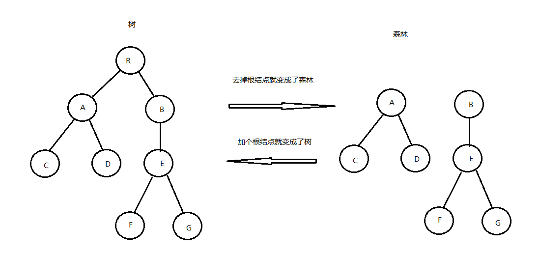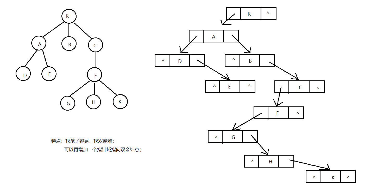 - 实现:用二叉链表作树的存储结构,链表中每个结点的两个指针域分别指向其第一个孩子结点和下一个兄弟结点。