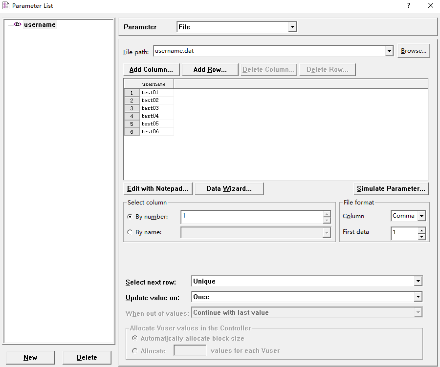 - Automatically allocate block size,此选项仅在Unique & iteration组合下可以选择,意思是自动给Vuser分配参数给每个Vuser,比如此例中6个参数,启动2个用户,如果选择Unique & iteration & Automatically allocate block size的组合,则每个用户分得3个参数,【test01、test02、test03】、【test04、test05、test06】;
