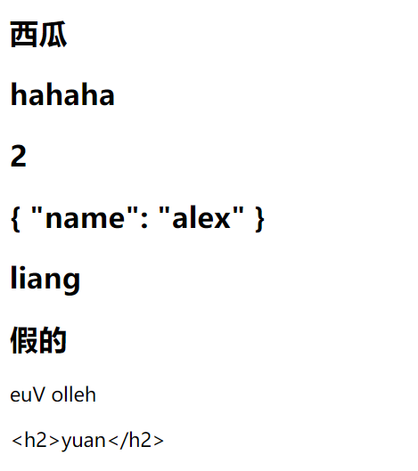 1 <!DOCTYPE html> 2 <html lang="en"> 3 <head> 4 <meta charset="UTF-8"> 5 <title>Title</title> 6 </head> 7 <body> 8 <div id="app"> 9 <h2>{{ msg }}</h2> 10 <h2>{{ 'hahaha' }}</h2> 11 <h2>{{ 1+1 }}</h2> 12 <h2>{{ {'name':'alex'} }}</h2> 13 <h2>{{ person.name }}</h2> 14 <h2>{{ 1>2? '真的':'假的' }}</h2> 15 <p>{{ msg2.split('').reverse().join('') }}</p> 16 <div>{{ text }}</div> 17 </div> 18 19 <script src="../vue.js"></script> 20 <script> 21 new Vue({ 22 el:'#app', //绑定 23 data:{ 24 msg:'西瓜', 25 person:{ 26 name:'liang' 27 }, 28 msg2:'hello Vue', 29 text:'<h2>yuan</h2>' 30 } 31 }); 32 </script> 33 </body> 34 </html>