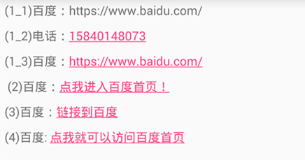 普通文本/URL/email/电话号码/map/自动识别,文本显示为可点击的链接。其中:设置为all时,系统会自动根据你的文本格式识别文本类型,如:http为web,tel为电话等;当然,以上内容也 可以在Java代码中完成,用法为tv.setAutoLinkMask(Linkify.ALL)。