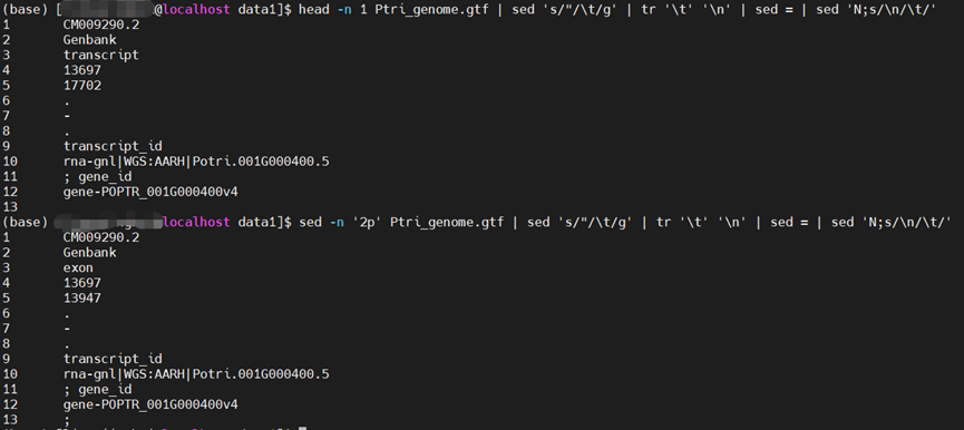 #本教程仿自于“https://zhuanlan.zhihu.com/p/439168788”。 #正则表达式教程https://www.runoob.com/regexp/regexp-tutorial.html。 #1,提取转录本 gffread Ptri_genome.gtf -g Ptri_genome.fa -w Ptri.transcripts.fa #2,CDS gffread Ptri_genome.gtf -g Ptri_genome.fa -x Ptri.cds.fa #3,Protein gffread Ptri_genome.gtf -g Ptri_genome.fa -y Ptri.protein.fa #4,Length of chromosomes cut -f 1,2 Ptri_genome.fa.fai > Ptri_chr.size #5,检查GTF文件第一行 head -n 1 Ptri_genome.gtf | sed 's/"/\t/g' | tr '\t' '\n' | sed = | sed 'N;s/\n/\t/' #6,检查GTF文件第二行 sed -n '2p' Ptri_genome.gtf | sed 's/"/\t/g' | tr '\t' '\n' | sed = | sed 'N;s/\n/\t/'